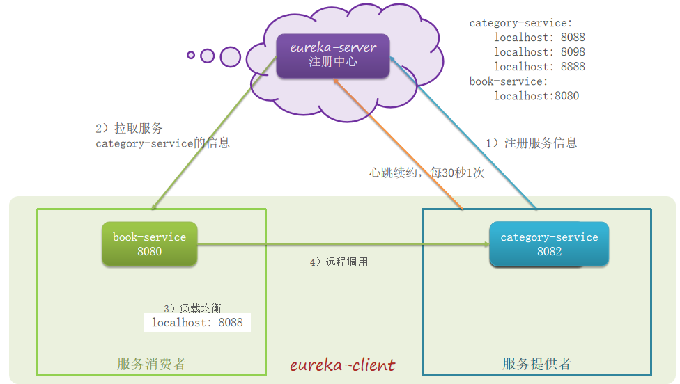- category-service服务实例启动后,将自己的信息注册到eureka-server(Eureka服务端)。这个叫服务注册